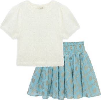 Fuzzy yarn brings fun texture to a short-sleeve sweater paired with a twirly foil-print skirt for an outfit your little one will love.
