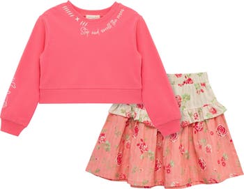 All will be rosy when your kid is wearing this cute 'fit that pairs an embroidered graphic sweatshirt with a flouncy tiered skirt featuring complementary rose prints.