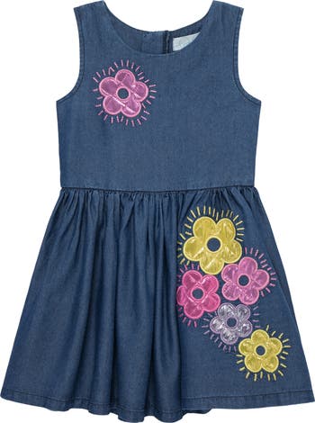 Colorful floral appliqués bring playful appeal to this chambray party dress that's lightweight and breathable.