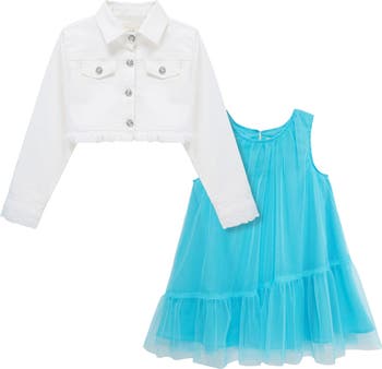They'll love the wispy movement of this organza dress paired with a coordinating denim jacket that has glamorous rhinestone buttons.