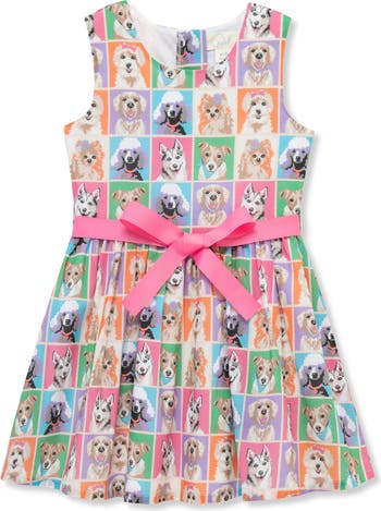 Dogs galore pose for their portraits on an A-line cotton dress that's completes with a pretty grosgrain ribbon.