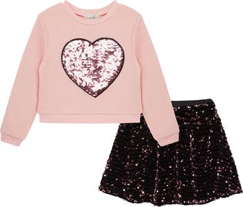 Your sparkle-loving child will be all smiles wearing this cozy heart-centered sweatshirt and A-line skirt covered in sequins.