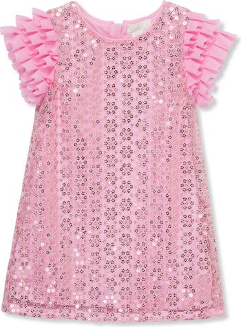 Your budding style star will be aptly dressed for a sparkling entrance in this party-perfect shift dress decorated with twinkling sequins. Tiered sleeves shaped from organza ruffles add fun flounce with every step.