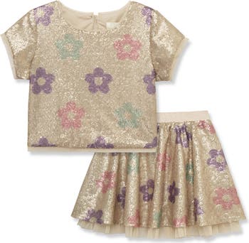 Flower power gets a shimmery upgrade in this matching kid-sized top-and-skirt set covered in sparkling sequins popped with colorful blooms.