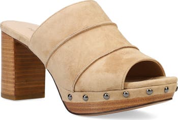 Polished studs add industrial shine to the platform toe of this playfully seamed leather sandal lofted on a stacked block heel.