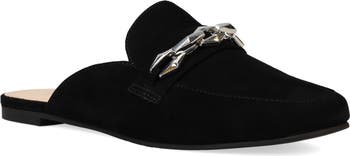 Geometric hardware makes a bold statement at the upper of an eye-catching mule fashioned with a loafer-inspired topline and squared-off moc toe.