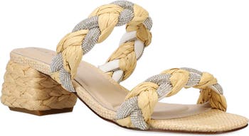 Braided raffia and crystal straps heighten the allure of this summery sandal balanced on a chunky block heel and cushioned footbed.