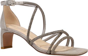 Rhinestone-encrusted straps crisscross over the vamp and instep of an occasion-ready sandal set on a cushioned footbed and demi block heel.