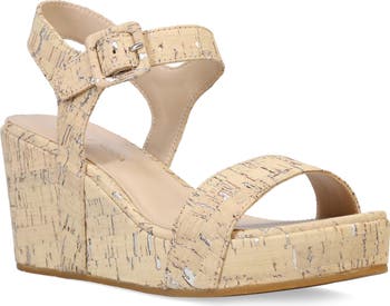 A cork-wrapped platform and wedge heel elevate a weekend-ready sandal secured with an adjustable strap at the ankle.