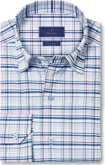 Effortlessly transition from boardroom meetings to after-hours drinks in this plaid sport shirt cut from stretch-enhanced performance fabric.