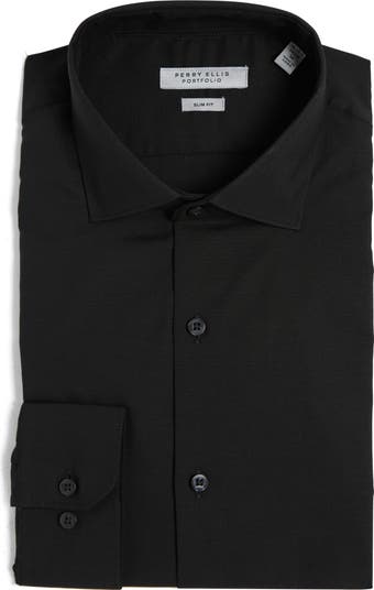 Stretch-enhanced fabric offers lasting comfort in a modern dress shirt cut in a slim fit that gives a fresh look.
