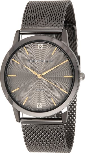 Two bright-white diamonds distinguish the 12- and 6-o'clock markers in the textured dial of a sophisticated timepiece set on a polished bracelet.