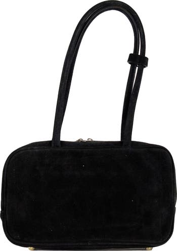 Buttery suede composition delivers a sophisticated feel to this structured shoulder bag topped with rolled handles.