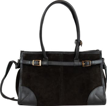 A combination of leather and suede paneling lends mixed-media appeal to an Italian-crafted bag that's topped by tubular straps for comfort throughout carry.