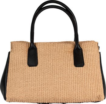 Woven straw panels bring sunny-day vibes to this roomy tote framed by pebbled-leather trim and fashioned with a removable, adjustable strap.