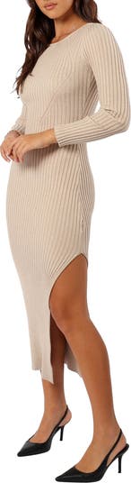 Wide ribbing traces the knit-to-fit silhouette of a sultry sweater dress finished with a leg-baring slit at one side.