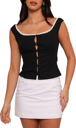 Destined for date night, this lace-trimmed tank is cut in a cropped silhouette and features airy front openings.