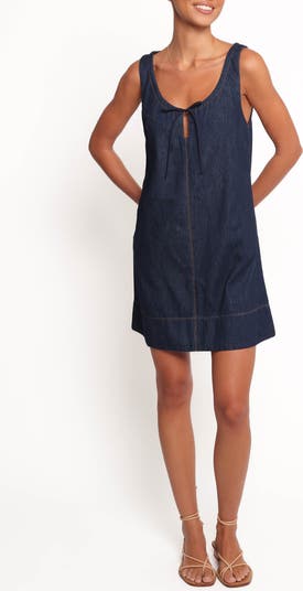 Breeze through your weekend in this sleeveless denim minidress framed by a dainty tie keyhole and handy side pockets.