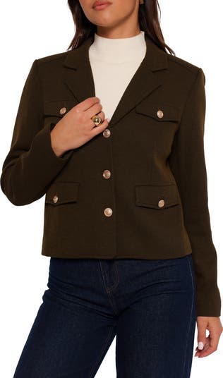 A playfully cropped silhouette amplifies the desk-to-dinner appeal of a textured blazer fashioned with gleaming buttons and functional front pockets.
