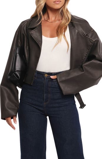 This cropped and boxy faux-leather jacket brings a bit of moto edge to any look with its biker-inspired detailing and belted waist.