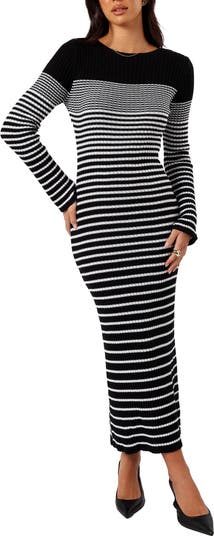 Varied stripes highlight the body-skimming fit of a long sweater-dress made from a cozy and chic rib knit.