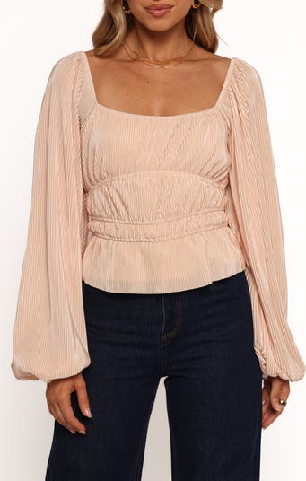 Radiate romance in this finely pleated satin top decorated with shirring at the waist for fabulous shape.