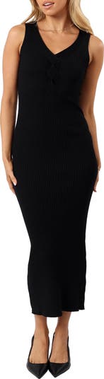 Refresh your date-night options with this sleeveless maxi sweater-dress made from a soft ribbed knit in a figure-skimming silhouette.