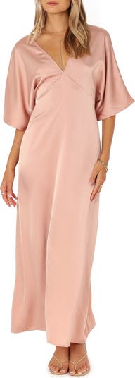 Drapey dolman sleeves frame a smooth satin maxi dress fashioned with a gracefully dipped back and attached waist ties.