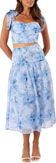 Lacy trim highlights the edges of this dreamy two-piece dress in an artistic floral pattern.