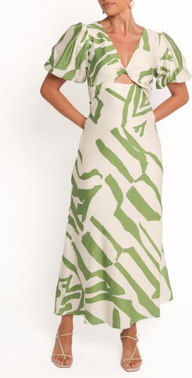 Verdant zebra-like stripes cover this maxi dress cut in an A-line silhouette and framed with pretty puff sleeves.