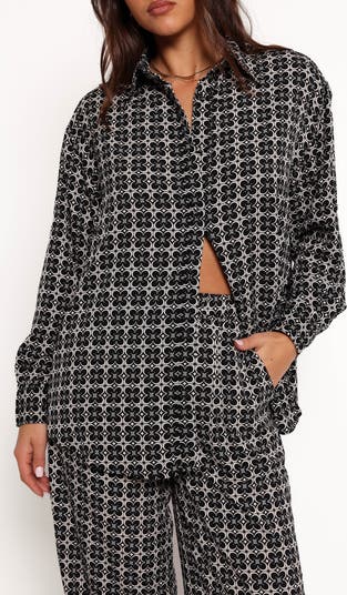 Build out your black-and-white collection with a relaxed button-up turned out in a jazzy print.