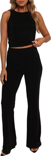 A subtle metallic shimmer adds an extra dose of glamour to a two-piece set featuring a sleeveless crop top and perfectly flared pants.
