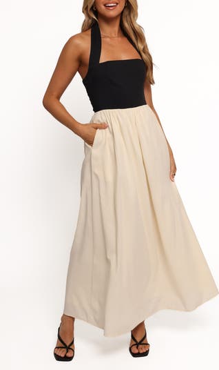 This cute colorblock maxi dress is cut from an airy cotton blend and balances a squared halter neck with a flowy A-line skirt.