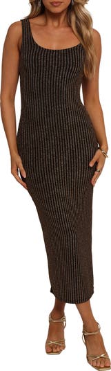 Allover ribbing shapes this close-fitting midi sprinkled with twinkling metallic shimmer and punctuated with a daring side slit for night-out perfection.