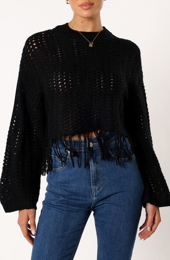 Fringed trim brings a bit of the boho aesthetic to a crewneck sweater knit with airy openwork stitches for a breathable fit and feel.