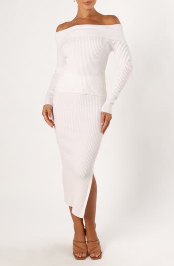 Soft, stretchy knit promises day-to-night comfort in this matching set pairing a high-waist figure-hugging skirt with an alluring off-the-shoulder top.