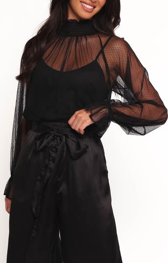 Feel poetically pretty when you layer up in this billowy mesh top covered in textured clip dots with a smocked turtleneck