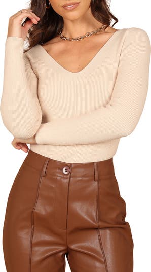 This close-fitting sweater is knit with dipped front-and-back necklines for day-to-night appeal.