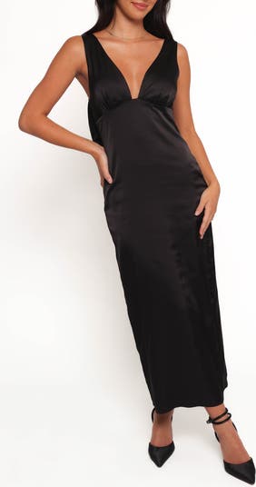 A pretty bow punctuates the low back of this figure-skimming maxi cut from lustrous satin with a soaring back slit.