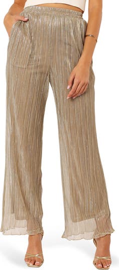 Plissé pleats bring a rich texture and dimension to wide-leg pants done in a metallic finish to shine brightly against casual or elevated looks.
