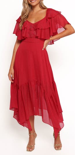 Ravishing ruffles amplify the romance of a date-worthy midi dress cut from shimmery chiffon and finished with a flounced handkerchief hem.