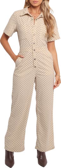 A dainty polka-dot print punctuates this soft corduroy jumpsuit boasting an easy snap-front closure and roomy pockets for utility-inspired style.