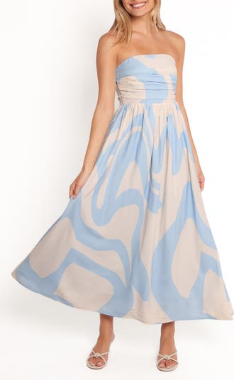 Horizontal pleating gathers the bodice of a twirly midi dress in a fit-and-flare silhouette with smocking at the back for a perfect fit.