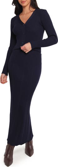 Fall for this chic, softly ribbed set designed with a fitted V-neck cardigan and a curve-skimming maxi skirt with a comfy elastic waist.