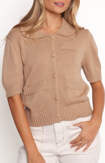 Preppy meets cozy in this polished short-sleeve knit cardigan topped with a charming collar.