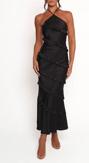 Flirty diagonal ruffles wrap around the silhouette of this stretch-satin maxi topped with a halter neckline.