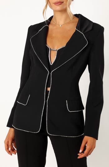 Crystal embellishments neatly outline the sophisticated silhouette of a blazer designed to cling to your curves for a sultry meets posh look.
