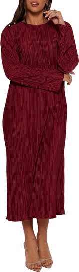 Fine allover pleats bring texture and movement to this longline shift crafted in a rich hue from glossy satin.