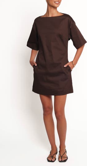 A twisted open back brings contemporary flourish to this A-line frock cut from stretch cotton in a mini length.