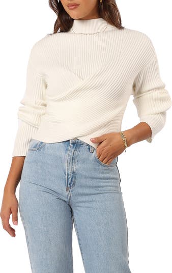 Feel the warmth of this mock-neck sweater shaped by a wrapped front and a cool cropped hem.